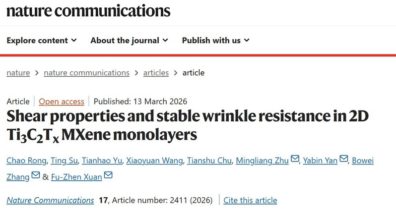 近日,我校机械与动力工程学院轩福贞教授团队在《自然·通讯》上发表了题为“二维Ti3C2Tx MXene单层纳米片的剪切性能和稳定抗皱特性”的研究论文,报道了该课题组在Ti3C2Tx 基柔性传感材料结构强度领域的最新研究进展,首次通过扫描透射电子显微镜并结合分子动力学模拟、第一性原理计算在原子尺度观察到二维材料剪切载荷下的损伤起源,打破了人们对二维材料剪切失稳的传统认知。